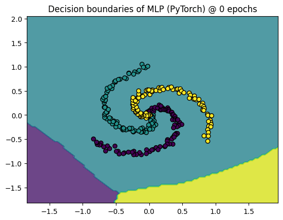 plt.title("Decision boundaries of MLP (PyTorch) @ " +