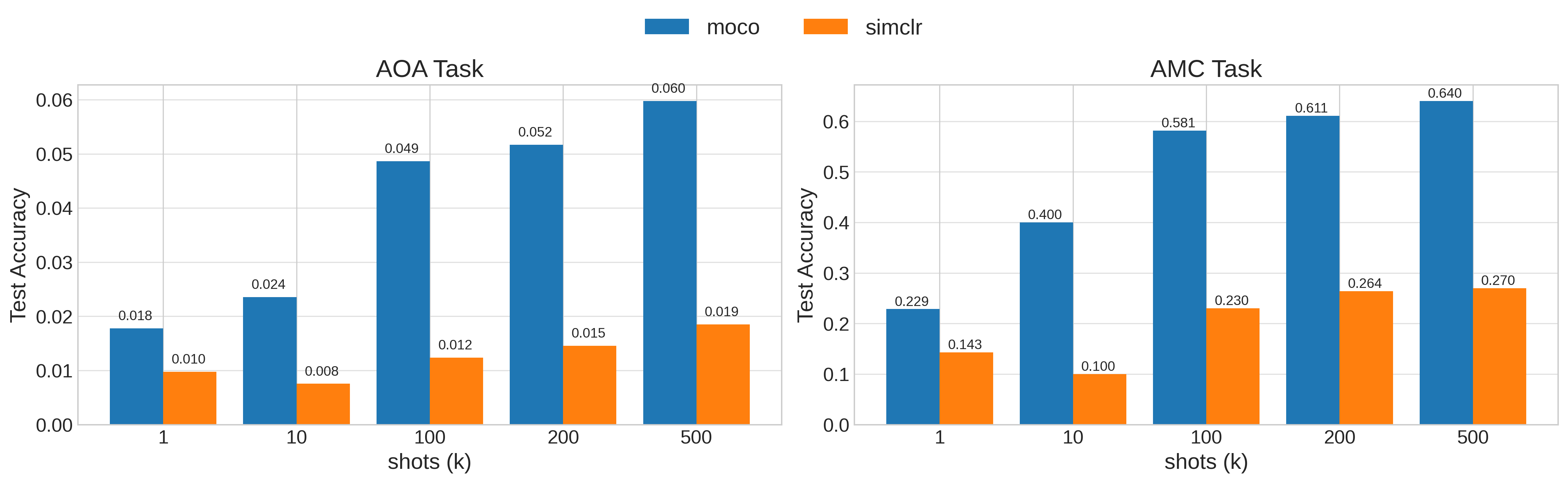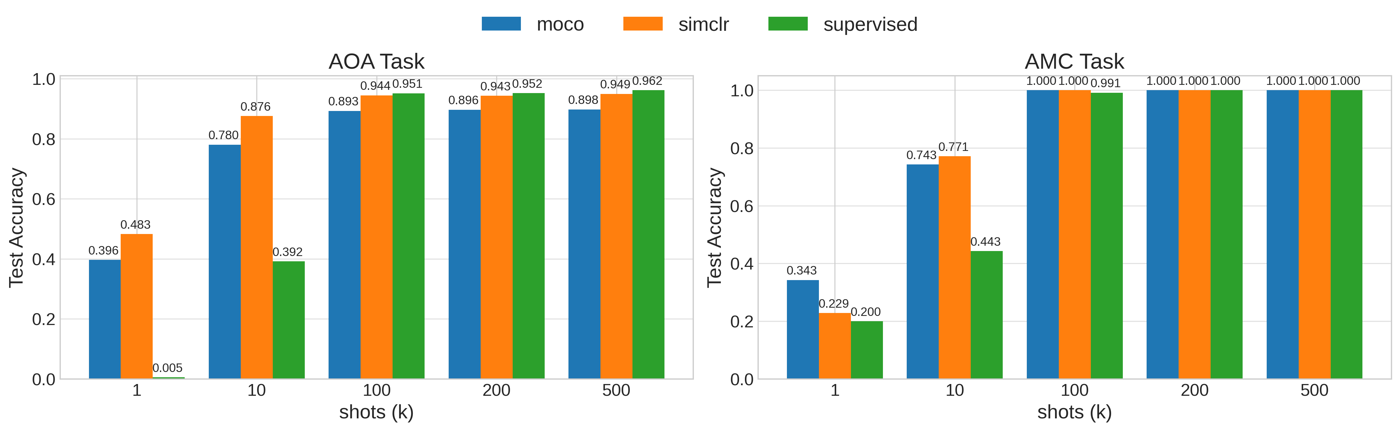 First, we compare both methods on the two downstream tasks associated with the pretraining dataset. The figure below presents the linear probing results (frozen pretrained encoder with a trainable lightweight MLP head) of the two methods compared with a supervised end-to-end trained model on each sample budget: 1, 10, 100, 200, and 500. The results show that both pretrained models are competitive with the supervised baseline. At high sample budgets, supervised training surpasses the pretrained models on the AoA task, but the pretrained methods remain competitive on AMC. Overall, SimCLR gives the stronger downstream performance across the comparison, although MoCo may provide slightly stronger linear separability on AMC at the extreme low-data regime, as suggested by the 1-shot result.