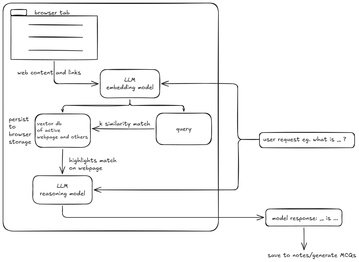 TabSage follows a retrieval-augmented generation (RAG) pipeline. When a user asks a question, the system retrieves the most relevant context and passes it to the reasoning model so the answer is grounded in what the user is actually viewing.